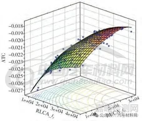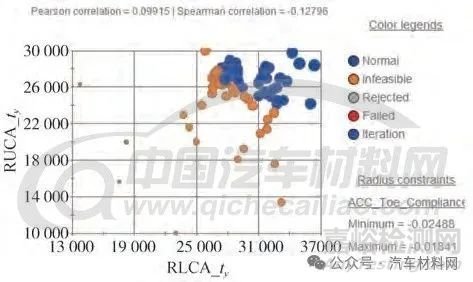 基于Spearman 相關(guān)性系數(shù)統(tǒng)計結(jié)果見表3,發(fā)現(xiàn)5個控制臂中的后下控制臂Y向剛度(RLCA_ty)和后上控制臂Y 向剛度(RUCA_ty)對ATC 性能影響較為顯著,基于組合代理模型提取顯著設(shè)計變量與關(guān)注性能的映射關(guān)系見圖4,可以預(yù)測,增加后下控制臂Y 向、后上控制臂Y 向靜剛度,能夠提升前束加速俯仰性能。
