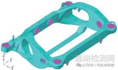 圖1 副車架基準(zhǔn)有限元模型及硬點示意圖