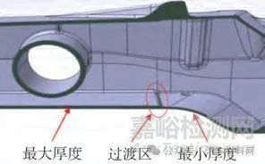 可以發(fā)現(xiàn):與第1 層級優(yōu)化特征不同,第2 層級拓?fù)鋬?yōu)化的特征是局部區(qū)域材料聚集,說明此區(qū)域?qū)π阅莒`敏度較高,需要在空心梁壁對應(yīng)區(qū)域的內(nèi)側(cè)或外側(cè)加強,改進為變壁厚的再次設(shè)計方案,并對方案進行性能驗證。本文副車架前橫梁中部區(qū)域?qū)π阅茏铎`敏,高靈敏度區(qū)域的單元密度也均接近1,同時為降低工藝難度,將圖9 中材料聚集區(qū)域均勻增加壁厚,前橫梁底部區(qū)域變厚度設(shè)計如圖10 所示,最大厚度和最小厚度之間的過渡區(qū)采用倒角平滑過渡,最大厚度采用工藝可行最大厚度6 mm,最小厚度采用工藝可行最小厚度4 mm,副車架結(jié)構(gòu)、厚度為左右對稱設(shè)計。
