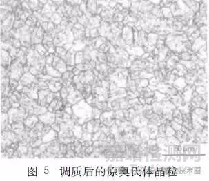 從掃描電鏡照片圖4可以看出,得到的組織確為珠光體+鐵素體平衡組織,只是有的地方珠光體不能連續(xù)成片狀而成斷續(xù)的片狀。這種經(jīng)過相變重結(jié)晶的平衡組織破壞了組織遺傳的可能性。試驗(yàn)檢測(cè),退火后的原奧氏體晶粒度級(jí)別大約為(6~8)級(jí)。以此種組織再進(jìn)行調(diào)質(zhì)處理,就會(huì)得到較為細(xì)小的回火索氏體組織,晶粒度為11級(jí),混晶確已消除如圖5所示。