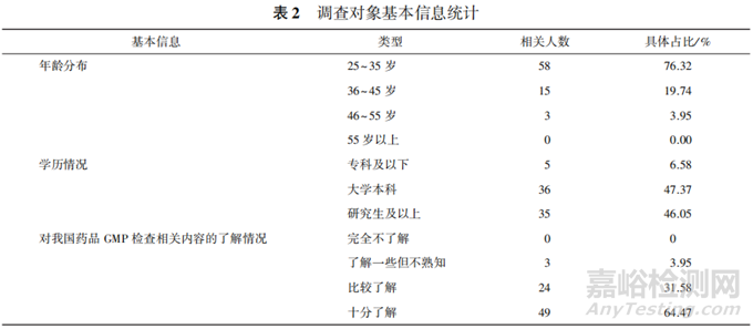 通過發(fā)放調(diào)查問卷,邀請專家和業(yè)內(nèi)人士對最初選取的一級指標與二級指標進行評價,最終獲得有效問卷總數(shù)共 76 份。調(diào)查對象蓋挑選的醫(yī)藥專業(yè)人士、藥品監(jiān)管部門工作人員、專/兼職檢查員,企業(yè)質(zhì)量管理人員、高??蒲腥藛T以及外企質(zhì)量管理人員等。