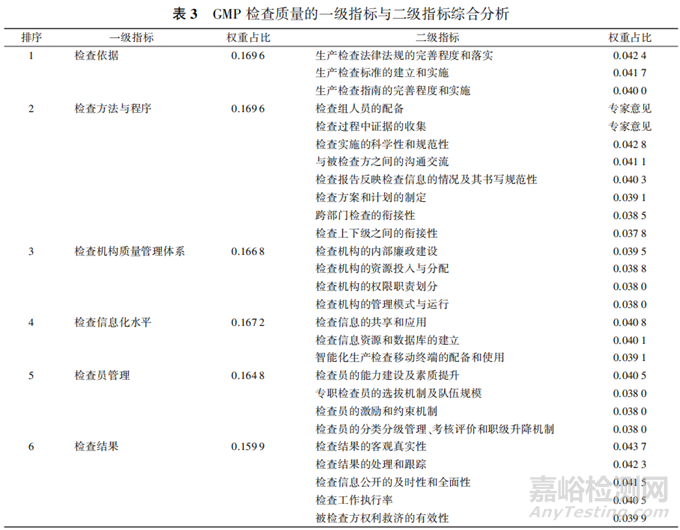 由統(tǒng)計數(shù)據(jù)可知,檢查依據(jù)和檢查方法與程序權重相同,均為 0.1696。這說明此2項指標在進行GMP 檢查質(zhì)量評價時至關重要,所以首先建立生產(chǎn)檢查法律法規(guī)并依據(jù)相應標準執(zhí)行才能確保后續(xù)GMP 檢查工作的順利實施;同時,確立檢查方法與程序,確保檢查程序的科學性、合理性、有效性是保障 GMP 檢查工作有效施行的重要內(nèi)容。
