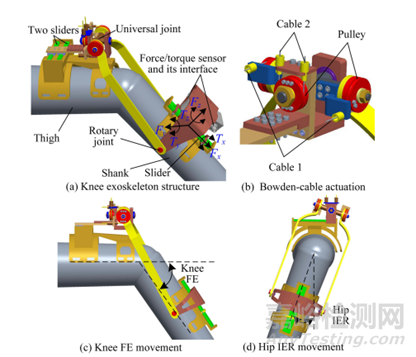 圖1 膝關(guān)節(jié)外骨骼的設(shè)計。(a)和(b)為整體結(jié)構(gòu)和驅(qū)動單元,(c)和(d)表示膝關(guān)節(jié)的屈曲伸展運動和髖部的內(nèi)旋外旋運動。