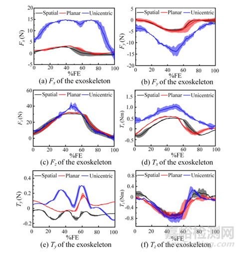 圖2 膝關(guān)節(jié)屈曲伸展輔助的相互作用力和力矩實驗結(jié)果。%FE表示任務(wù)進度的百分比。