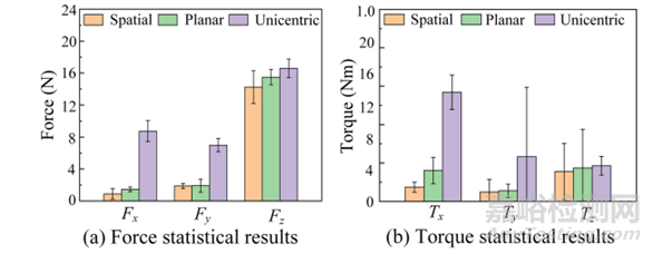 實驗結(jié)果如下:圖2給出了在輔助膝關(guān)節(jié)屈曲伸展運動期間的相互作用力和扭矩的實驗結(jié)果。定義每個力/力矩的均值的絕對值為AM。定義三個力/力矩的AM平方和的算術(shù)平方根為力/力矩的SRAM。圖3給出了三個外骨骼的AM的結(jié)果。相對基于平面自對齊機構(gòu)的外骨骼機器人,所設(shè)計的膝關(guān)節(jié)外骨骼的Fx,F(xiàn)y,F(xiàn)z,Tx,Ty和Tz的AM分別降低了38.8%,2.0%,8.0%,53.7%,11.5%和10.6%;相對傳統(tǒng)單軸外骨骼,降低了89.8%、73.1%、14.1%、87.0%、79.1%和16.3%。相對基于平面自對齊機構(gòu)的外骨骼,所設(shè)計外骨骼機器人的力和力矩的SRAMs分別降低了8.1%和26.4%;相對傳統(tǒng)單軸外骨骼,降低了28.1%和72.1%。