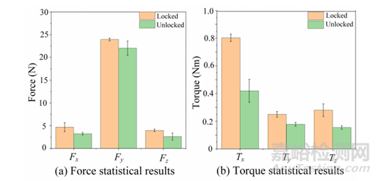 圖4展示了髖關(guān)節(jié)內(nèi)旋外旋運動輔助的實驗結(jié)果,圖5呈現(xiàn)了滑塊解鎖和滑塊鎖定狀態(tài)下的AM結(jié)果。在滑塊解鎖狀態(tài)下,開發(fā)的外骨骼的Fx,F(xiàn)y,F(xiàn)z,Tx,Ty和Tz的AM分別比鎖定狀態(tài)下低了30.5%,8.0%,33.7%,47.8%,28.6%和44.8%。相對滑塊鎖定狀態(tài),所設(shè)計的膝關(guān)節(jié)外骨骼在滑塊解鎖狀態(tài)下的力和矩SRAM分別比鎖定狀態(tài)下低了6.4%和45.7%。實驗結(jié)果表明,在膝關(guān)節(jié)屈曲伸展和髖關(guān)節(jié)內(nèi)旋外旋運動兩種運動輔助功能方面,所提出的外骨骼均比現(xiàn)有的外骨骼表現(xiàn)出更低的相互作用力和力矩。