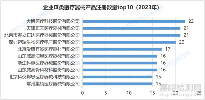 其中,2023年全國(guó)共有1229家企業(yè)注冊(cè)Ⅲ類(lèi)醫(yī)療器械產(chǎn)品,注冊(cè)數(shù)量排名第一的企業(yè)是大博醫(yī)療科技股份有限公司,產(chǎn)品注冊(cè)數(shù)為22件。