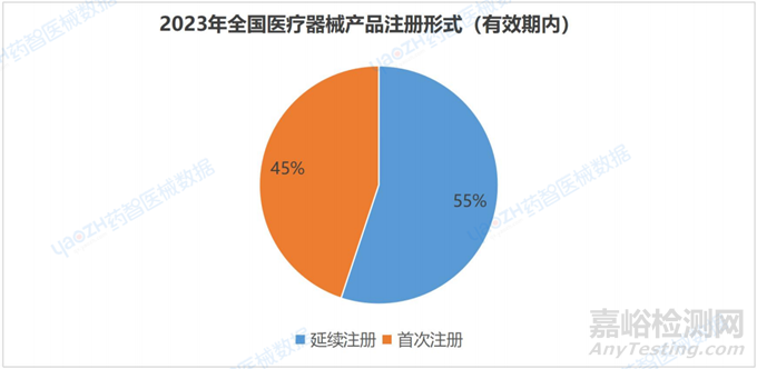從產(chǎn)品注冊(cè)形勢(shì)來(lái)看,2023年全國(guó)醫(yī)療器械產(chǎn)品延續(xù)注冊(cè)產(chǎn)品數(shù)量占全部醫(yī)療器械產(chǎn)品注冊(cè)的55%。