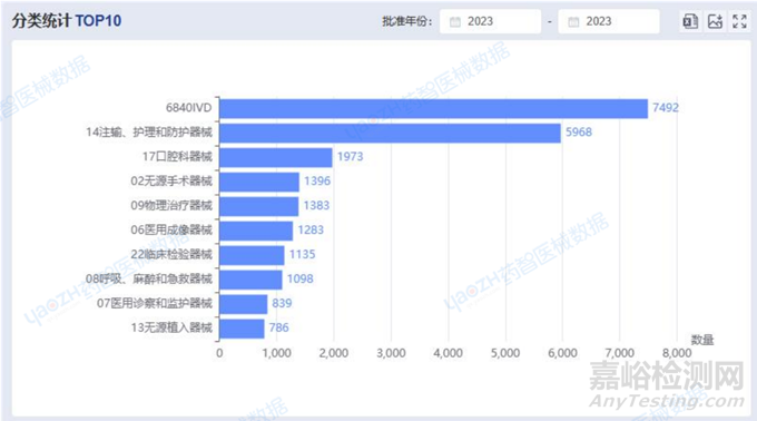 從產(chǎn)品類(lèi)別來(lái)看,2023年全國(guó)注冊(cè)醫(yī)療器械產(chǎn)品中,體外診斷試劑(7492件),注輸、護(hù)理和防護(hù)器械(5968件)及口腔科器械(1973件)注冊(cè)數(shù)量位列前三。