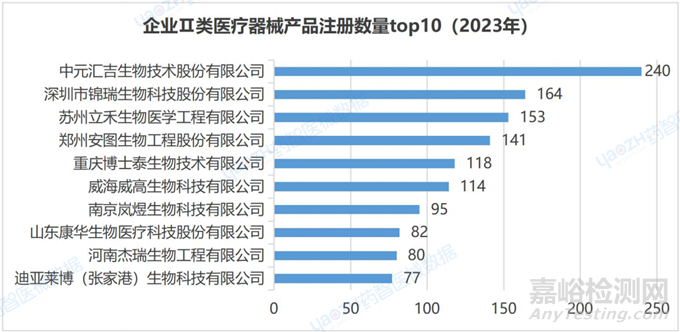 其中,2023年全國(guó)共有7073家企業(yè)注冊(cè)Ⅱ類(lèi)醫(yī)療器械產(chǎn)品,注冊(cè)數(shù)量排名第一的企業(yè)是中元匯吉生物技術(shù)股份有限公司,產(chǎn)品注冊(cè)數(shù)為240件。