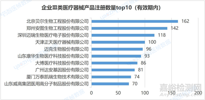 從企業(yè)注冊(cè)數(shù)量來(lái)看,截至2024年2月,在有效期內(nèi)全國(guó)共有3048家企業(yè)注冊(cè)Ⅲ類(lèi)醫(yī)療器械產(chǎn)品,注冊(cè)數(shù)量排名第一的企業(yè)是北京貝爾生物工程股份有限公司,產(chǎn)品注冊(cè)數(shù)為162件。
