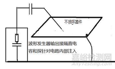 靜電干擾的失效本身就是由靜電的高頻頻譜能量引起的,采用波形發(fā)生器模擬該高頻能量進(jìn)行注入能夠大概率的復(fù)現(xiàn)到相同的干擾現(xiàn)象。波形發(fā)生器采用10MHz方波脈沖50%占空比,1-10V峰峰值輸出能夠模擬出ESD在10-300MHz頻段的頻譜和幅值(針對(duì)不同問(wèn)題可以調(diào)整模擬波形參數(shù)進(jìn)行問(wèn)題復(fù)現(xiàn)),通過(guò)電容進(jìn)行隔離直流之后利用金屬探針就能對(duì)電路內(nèi)部進(jìn)行注入探測(cè)。這種方法不依賴(lài)其他資源而且可以在研發(fā)場(chǎng)地方便的進(jìn)行(只需要使用波形發(fā)生器、示波器、頻譜儀、接地參考板等),可以讓研發(fā)工程師非常從容地去分析和優(yōu)化解決方案。