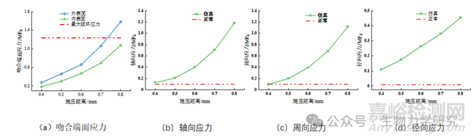 在正常血壓狀態(tài)下,血管主要受到軸向、周向和徑向的應力,其中軸向和周向應力的量級為0.1 MPa(拉力),徑向應力量級為0.01 MPa(壓力)。因此,吻合器對血管組織在3個方向上施加的應力應大于正常情況,才能達到良好的吻合。本文結果顯示,在不同施壓距離下,吻合端面在軸向和徑向應力均大于生理狀態(tài)下的拉(壓)力[見圖2(b)、(d)],而當施壓距離為0.4 mm時,其周向應力小于生理狀態(tài)下的壓力,不滿足良好吻合的條件[見圖2(c)]。