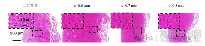 觀察吻合后的組織微觀結構,正常組織的彈性纖維和和膠原纖維呈現(xiàn)出網(wǎng)狀結構,外膜為疏松的結締組織。而組織受到擠壓后,內(nèi)部結構變得緊密。當施壓距離為0.6、0.7 mm時,組織的平滑肌細胞排列有序。當施壓距離為0.8 mm時,由于組織受到過度的擠壓,導致細胞排列發(fā)生紊亂(見圖4)。