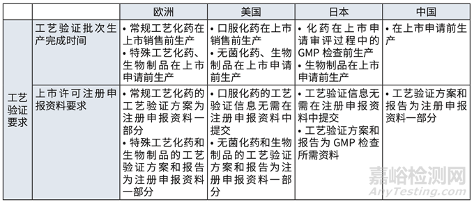 對比歐美日等國家及我國對工藝驗證批次生產(chǎn)完成時間、上市許可申報資料要求等,我國要求工藝驗證批次的生產(chǎn)發(fā)生在上市申請前,工藝驗證方案及報告,兩者均作為注冊申報資料的一部分。