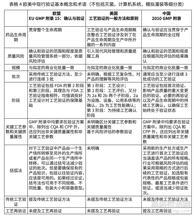 通過比對發(fā)現(xiàn)我國的 GMP 附錄確認和驗證與 EU GMP Annex 15 高度協(xié)調(diào)但是有一些基本原則(principle 和 general 部分)沒有明確表述。比如對于驗證批次的問題,中歐都是基于風險至少三批,但是歐洲在工藝驗證的一般原則部分明確提出可以使用括號法,并說明可以考慮 括號法的情況。具體各個部分的詳細內(nèi)容,見表格 4。