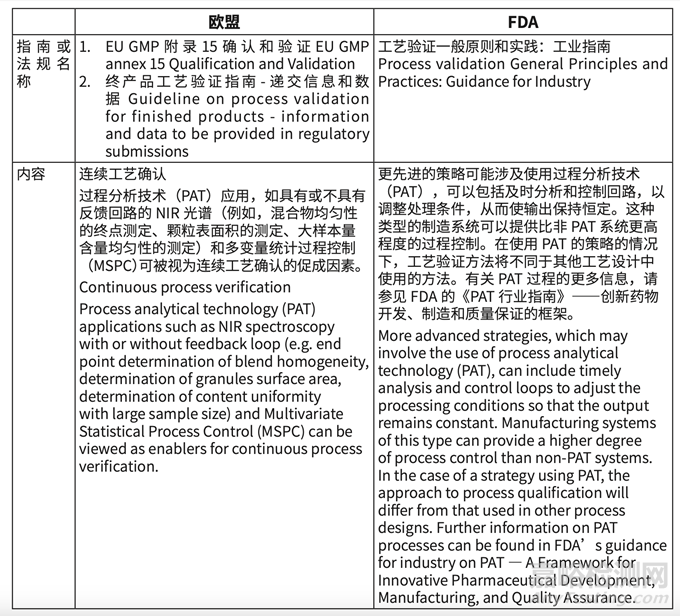 2)歐洲明確提出工藝驗證有傳統(tǒng)工藝驗證,連續(xù)工藝確認(Continuous process verification)和混合方式,美國沒有明確提出概念以區(qū)分不同的驗證方式(注美國術語 continuous process verification 與歐洲的內(nèi)涵不同,是第三階段,詳見下表,但是文字描述 上也有提出了工藝驗證(FDA 術語 PPQ)的不同方式,比如 PAT 的驗證不同。