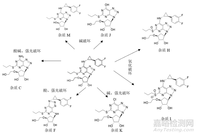 新增雜質(zhì)統(tǒng)計及雜質(zhì)譜分析:應(yīng)統(tǒng)計各降解條件下的主要新增雜質(zhì),必要時采用液質(zhì)聯(lián)用法確定雜質(zhì)分子量,并通過結(jié)構(gòu)特征推測降解雜質(zhì)的結(jié)構(gòu)。下圖(圖譜來源于文獻5)是替格瑞洛強制降解試驗的雜質(zhì)譜研究結(jié)果。