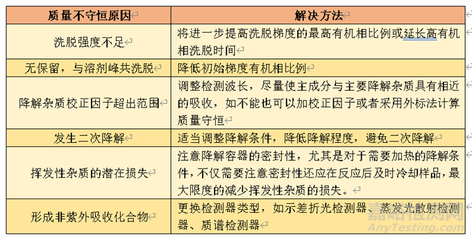 質(zhì)量守恒:質(zhì)量守恒是建立穩(wěn)定性指示分析方法的重要指標(biāo),一般認(rèn)為質(zhì)量守恒在90%~110%之間認(rèn)為是對有關(guān)物質(zhì)評估無顯著影響的,誤差主要來源于儀器、操作、校正因子、積分設(shè)置等。