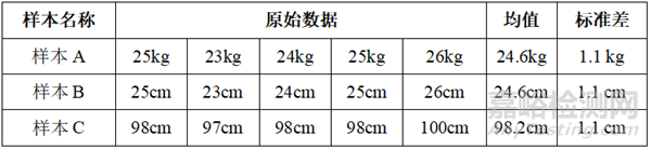 <2> 樣本B、樣本C的標準差都是1.1cm,但是均值差異較大,對于同樣的波動數值,相對于樣本B、C的波動程度不同。
