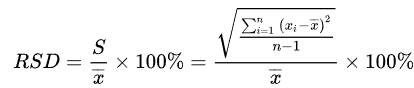 從公式中可以看出,相比于“標準差”,“RSD”的分母中引入均值,故而消除了樣本間單位和均值的影響,使得不同樣本間的精密度水平具有比較意義。