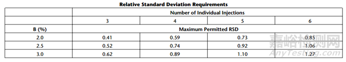 ● 減少進樣次數而不影響結果評價的替代方法:根據JP的專著,可依據進樣次數的不同(3~5針)按下表調整可接受限度。