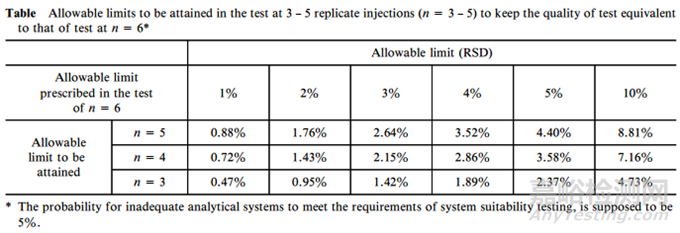 ● 減少進樣次數而不影響結果評價的替代方法:特定條件下【活性物質/賦形劑的含量測定,其純物質的含量值為100%,且各論沒有規(guī)定時】,可依據進樣次數的不同(3~6針)按下表調整可接受限度。其原理是基于90%置信水平的t檢驗,感興趣小伙伴可以自行按照下列公式進行計算。(備注:K為常數0.349)