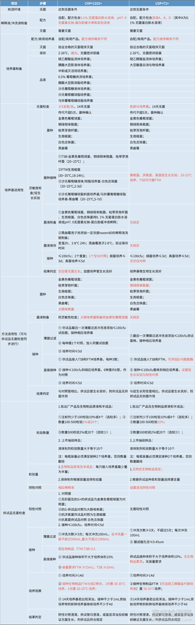 下表匯總對(duì)比了無(wú)菌檢查法在中美藥典中的差異,其中紅色標(biāo)記為需要重點(diǎn)關(guān)注的地方。