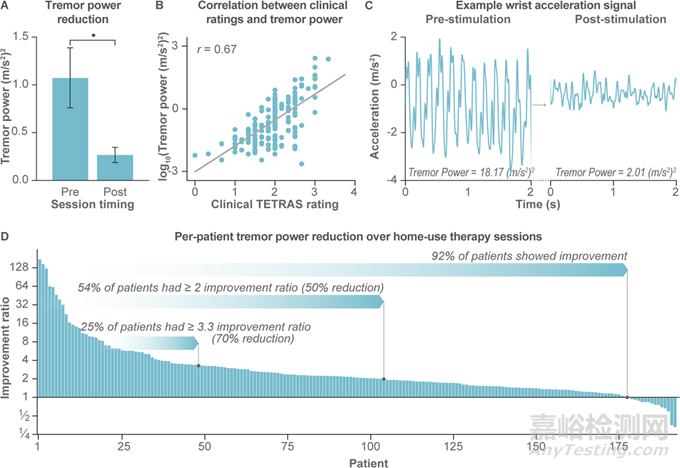 (A)平均震顫功率從刺激前到刺激后下降了至少50%(數(shù)據(jù)代表 193 名患者和 21,806 次總療程)。誤差線代表 ±1 SEM,* 表示 p < 0.0001。