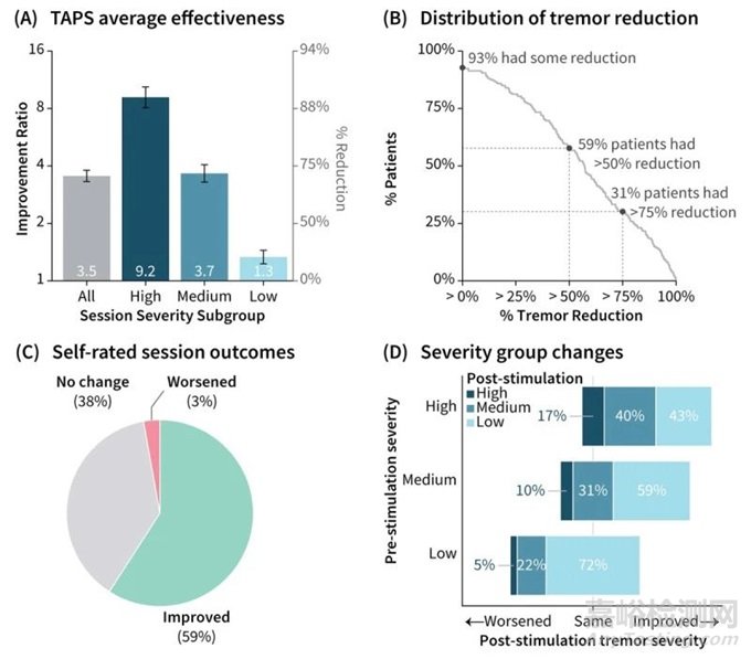 (C) TAPS 后改善的患者自我評(píng)分在分布上與 TAPS 后改善的運(yùn)動(dòng)傳感器評(píng)分相似。(D) 針對(duì)每個(gè)刺激前嚴(yán)重程度組細(xì)分刺激后震顫嚴(yán)重程度類(lèi)別的頻率。TAPS 改進(jìn)了大多數(shù)開(kāi)始為“高”或“中”的會(huì)話的震顫嚴(yán)重程度類(lèi)別,并為開(kāi)始為“低”的會(huì)話維持了“低”震顫。