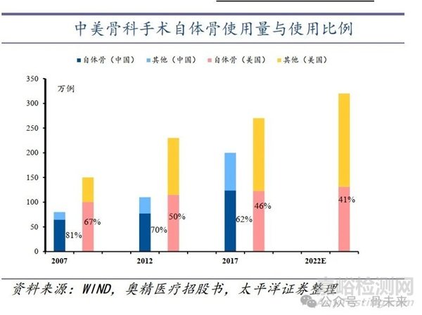 如上圖所示,中美兩國骨科臨床自體骨的使用比例均逐步下降。自體骨作為傳統(tǒng)認識中的行業(yè)“金標準”仍存在著來源不足、二次傷害、供區(qū)并發(fā)癥等風險,骨修復材料有巨大的臨床需求空缺,亟待優(yōu)質人工骨材料來填補。