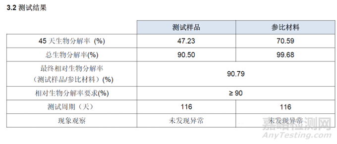 該測(cè)試樣品在116天結(jié)束測(cè)試時(shí)相對(duì)生物降解率超過了90%,滿足了GB/T 41010的a)要求中對(duì)整個(gè)產(chǎn)品相對(duì)生物降解率的要求。