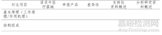 (2)提交申報產(chǎn)品與《目錄》中已獲準境內(nèi)注冊醫(yī)療器械的對比說明,對比說明應當包括《申報產(chǎn)品與目錄中已獲準境內(nèi)注冊醫(yī)療器械對比表》(見表3)和相應支持性資料。若經(jīng)對比,申報產(chǎn)品與對比產(chǎn)品存在差異,還應提交差異部分對安全有效性影響的分析研究資料。二者的差異不應引起不同的安全有效性問題,即申報產(chǎn)品未出現(xiàn)對比產(chǎn)品不存在的且可能引發(fā)重大風險和/或引起顯著影響有效性的問題。