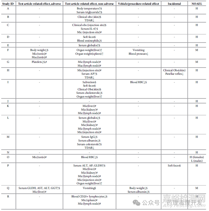 20項(xiàng)研究中,有2項(xiàng)未見任何毒理學(xué)異常發(fā)現(xiàn),予以剔除。剩余18項(xiàng)研究中,有4項(xiàng)出現(xiàn)了供試品相關(guān)的不良反應(yīng),研究ID分別為F、G、O、Q,如下表所示。