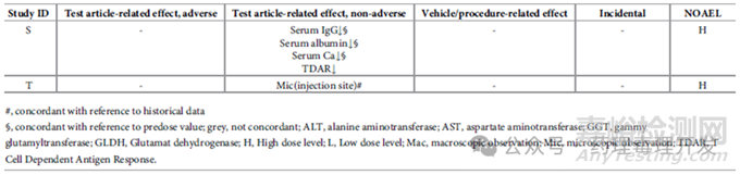 TDAR主要用于檢測(cè)免疫功能包括抗原攝取、遞呈、輔助性T細(xì)胞功能、B細(xì)胞激活和抗體產(chǎn)生。通過采用標(biāo)準(zhǔn)抗原如KLH進(jìn)行免疫,然后檢測(cè)免疫球蛋白IgM、IgG。B研究中,與平行陰性對(duì)照相比,給藥組免疫后的IgG水平下降,考慮到與供試品的作用機(jī)制相關(guān),未被定為不良反應(yīng)。如果不參照平行對(duì)照數(shù)據(jù),TDAR的異常結(jié)果無法判定。這點(diǎn)在H、M、S研究中同樣存在。