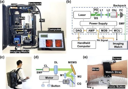為了將通常笨重的儀器變成可以在四處走動(dòng)時(shí)佩戴的東西,研究人員開發(fā)了一種緊湊的光學(xué)分辨率光聲顯微鏡系統(tǒng),該系統(tǒng)基于緊湊的脈沖激光器,緊湊的光纖光路和集成電子系統(tǒng),裝在一個(gè)重達(dá)7公斤的背包中。他們還設(shè)計(jì)了一種手持設(shè)備來(lái)存儲(chǔ)圖像,并創(chuàng)建了一個(gè)小型化的手表式成像界面,該界面具有可調(diào)節(jié)的焦平面和用于實(shí)時(shí)顯示圖像的屏幕顯示器。