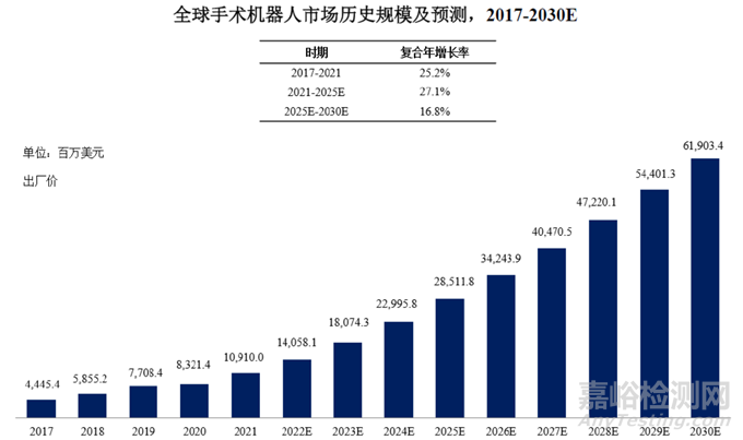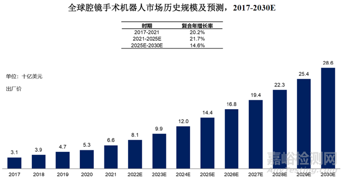 2017 年至2021 年,全球腔鏡手術(shù)機(jī)器人市場規(guī)模自31 億美元增長至66 億美元,該期間的復(fù)合年增長率為20.2%。全球腔鏡手術(shù)機(jī)器人市場規(guī)模將不斷增長,預(yù)計(jì)2025 年將達(dá)到144 億美元,2021 年至2025 年的復(fù)合年增長率為21.7%,2030 年將達(dá)到286 億美元,2025 年至2030 年的復(fù)合年增長率為14.6%。