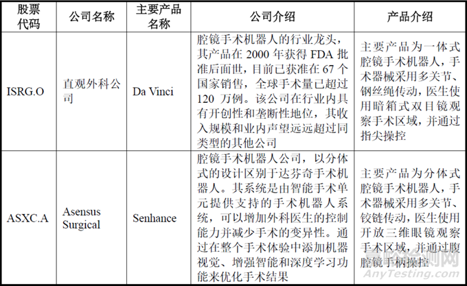在腔鏡手術(shù)機(jī)器人領(lǐng)域,全球最大的公司為美國的直觀外科公司,美股同類型上市公司還有Asensus Surgical,這兩家公司的具體情況如下:
