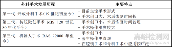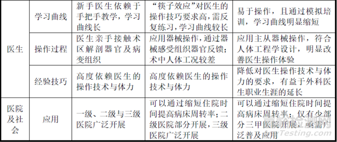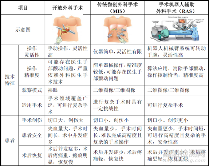 手術(shù)機(jī)器人輔助外科手術(shù)可協(xié)助人類克服生理上的限制,其具有操作精準(zhǔn)度高、操作穩(wěn)定以及可重復(fù)性強(qiáng)等特點(diǎn),就精度要求較高的微創(chuàng)手術(shù)而言,手術(shù)機(jī)器人為微創(chuàng)手術(shù)患者帶來了極大的臨床效益。開放外科手術(shù)、微創(chuàng)外科手術(shù)以及手術(shù)機(jī)器人輔助外科手術(shù)對比分析如下表所示: