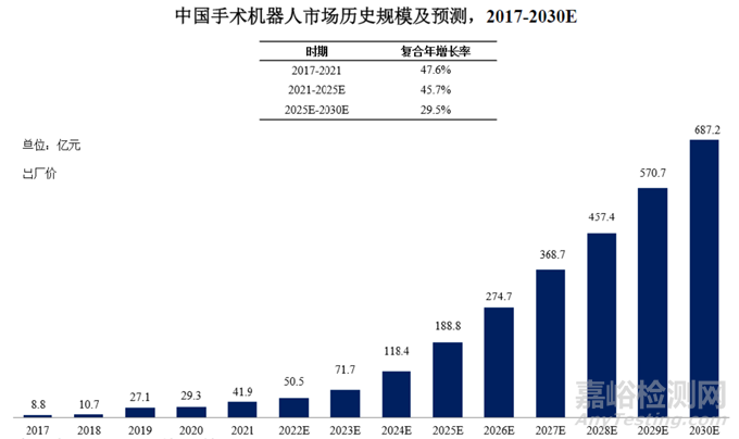 中國手術(shù)機(jī)器人起步較晚,自2017 年至2021 年,中國手術(shù)機(jī)器人市場由8.8 億元增長至近41.9 億元,該期間的復(fù)合年增長率為47.6%。未來,中國手術(shù)機(jī)器人市場將持續(xù)增長,預(yù)計(jì)2025 年中國手術(shù)機(jī)器人市場將達(dá)到188.8 億元,2021 年至2025 年的復(fù)合年增長率為45.7%。2030 年,中國手術(shù)機(jī)器人市場將達(dá)687.2 億元,2025 年至2030 年的復(fù)合年增長率為29.5%。