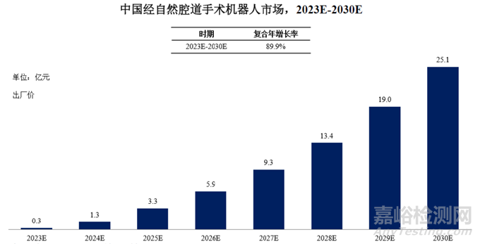 中國經(jīng)自然腔道手術(shù)機(jī)器人可能將于未來五年陸續(xù)獲批上市。預(yù)計(jì)中國經(jīng)自然腔道手術(shù)機(jī)器人市場2023 年將達(dá)0.3 億元。隨著精準(zhǔn)診斷與微創(chuàng)手術(shù)的意識深化,以及經(jīng)自然腔道手術(shù)機(jī)器人學(xué)術(shù)推廣力度的增強(qiáng),預(yù)計(jì)未來中國經(jīng)自然腔道手術(shù)機(jī)器人于三級醫(yī)院的滲透率將呈平穩(wěn)增長,并逐漸開始于二級醫(yī)院進(jìn)行滲透。2030 年,中國經(jīng)自然腔道手術(shù)機(jī)器人市場預(yù)計(jì)將達(dá)25 億元。
