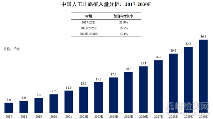 根據(jù)弗若斯特沙利文,2021 年中國重到極重度聽力損失的患者中,感音神經(jīng)性和混合性聽力損失的患者人數(shù)達(dá)到1,421 萬。人工耳蝸植入作為輔助重到極重度聽力損失患者聽聲的重要治療手段,需求量將不斷擴(kuò)大。2017 年至2021 年,中國人工耳蝸植入手術(shù)量從5 千例增加到1.1 萬例,復(fù)合年增長率為21.9%,預(yù)計(jì)2025 年將達(dá)到2 萬例,2021 年至2025 年復(fù)合年增長率為16.5%。預(yù)計(jì)2030 年人工耳蝸植入手術(shù)量將達(dá)到3.6 萬例,2025 年至2030 年復(fù)合年增長率12.4%。