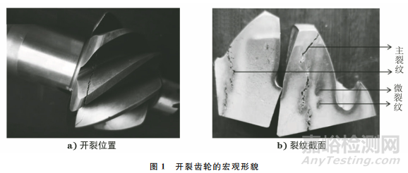 開裂齒輪的宏觀形貌如圖1所示。由 圖1可知:裂紋靠近齒輪端部,垂直于軸向,裂紋橫穿齒面并延伸至齒根位置;裂紋寬度為1~2mm,裂紋貫穿整個(gè)齒部,在主裂紋附近及較遠(yuǎn)的區(qū)域可見獨(dú)立微裂紋。