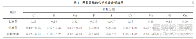 開裂齒輪的化學(xué)成分分析結(jié)果如表1所示。由表1可知:該齒輪的化學(xué)成分滿足標(biāo)準(zhǔn)及內(nèi)控要求。