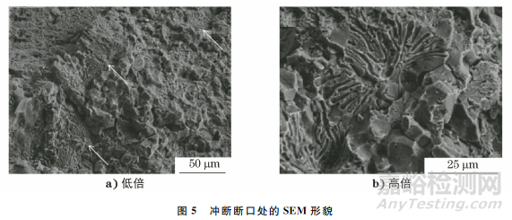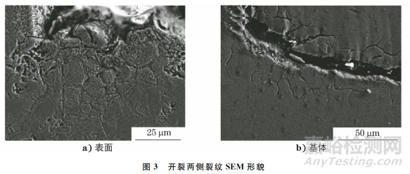 將裂紋處打斷,在斷口處截取試樣,利用掃描電鏡對試樣進(jìn)行分析,結(jié)果如圖3所示。由圖3可知:斷口處開裂較為嚴(yán)重,試樣表面裂紋處破碎程度較嚴(yán)重,主裂紋兩側(cè)呈沿晶開裂的典型特征;基體內(nèi)的主裂紋未見沿晶開裂形貌,但是其兩側(cè)裂紋的沿晶走向明顯。