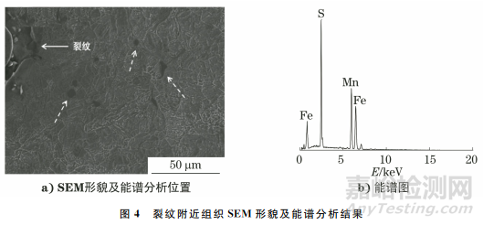裂紋附近組織SEM形貌及能譜分析結(jié)果如圖4所示。由圖4可知:裂紋附近組織晶粒的晶界上存在點(diǎn)狀、短棒狀等形態(tài)的異物,該異物為硫化錳夾雜物。