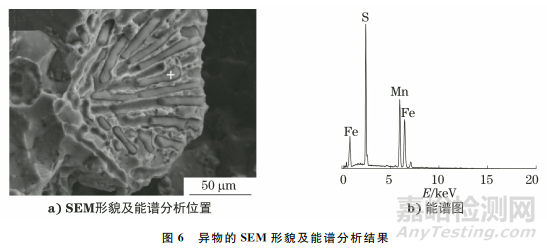 用掃描電鏡及能譜儀對異物進(jìn)行分析,結(jié)果如圖6所示。由圖6可知:異物為硫化錳夾雜物,且枝晶狀的硫化錳夾雜物沿晶界分布。