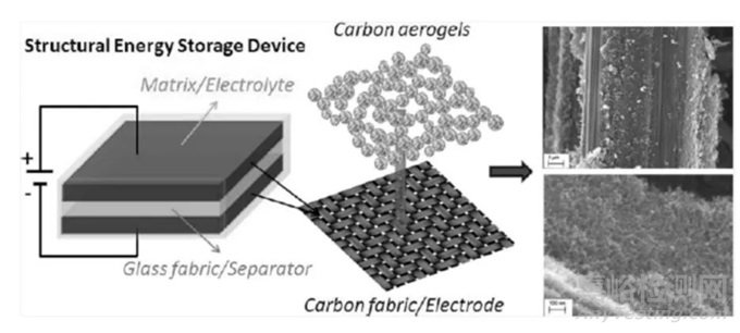 2013年,ICL繼續(xù)提出了利用碳氣凝膠(CAG)改性碳纖維織物作為電極制備電容器的方法。制備CAG改性碳纖維電極的方法,首先將碳氣凝膠前驅體間苯二酚-甲醛與催化劑KOH充分混合,隨后將混合物通過浸漬/注射方法充分浸潤碳纖維編制布中,最后將碳維編制布在N2環(huán)境中800 ℃碳化30 min得到改性碳纖維電極。這種改性方法可以大幅度提高電極的電極容量,最高可達62 F/g。利用改性電極制備的電容器能量密度可達1 Wh/Kg(3600 J/kg),較ARL制備的結構/儲能一體化電容器(能量密度10-6 J/Kg)有極大的提升。