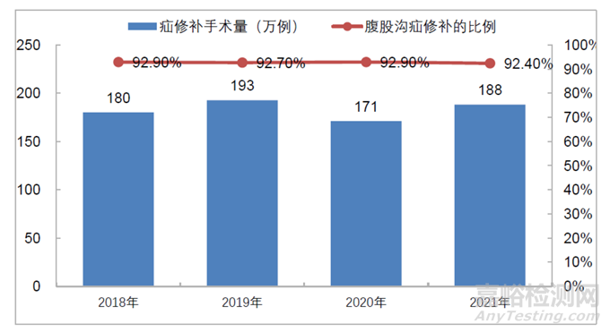 根據(jù)標(biāo)點(diǎn)信息的行業(yè)研究報(bào)告,2019 年我國(guó)疝修補(bǔ)手術(shù)量超過(guò) 190 萬(wàn)例,同比增長(zhǎng) 7%。2020 年受到外部環(huán)境等不利因素影響,全國(guó)各類門(mén)診和手術(shù)的開(kāi)展受到限制,因此疝修補(bǔ)手術(shù)總量出現(xiàn)下滑,為 171 萬(wàn)例。2021 年,隨著人民生活和各項(xiàng)社會(huì)活動(dòng)回歸正常,2021 年我國(guó)疝修補(bǔ)手術(shù)實(shí)現(xiàn)恢復(fù)性增長(zhǎng),達(dá)到 188 萬(wàn)例。預(yù)計(jì) 2025 年,疝修補(bǔ)手術(shù)數(shù)量將達(dá)到 248 萬(wàn)例。
