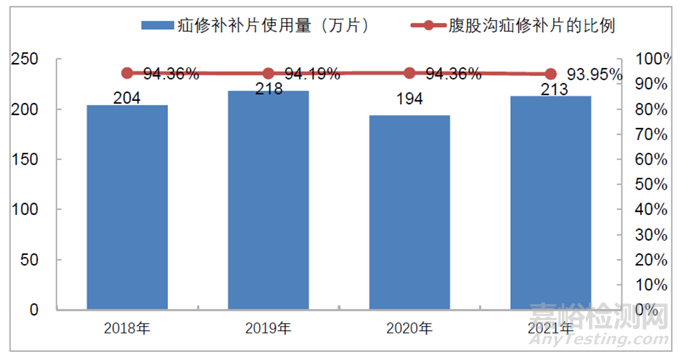 根據(jù)標(biāo)點(diǎn)信息的行業(yè)研究報(bào)告統(tǒng)計(jì),2019 年我國(guó)疝修補(bǔ)片的使用量達(dá)到218 萬(wàn)片,同比增長(zhǎng)約 7%,2020 年受到外部環(huán)境等不利因素影響,補(bǔ)片使用量隨手術(shù)量的減少而下滑,2021 年呈現(xiàn)出了 9.88%的增長(zhǎng)率,疝修補(bǔ)片的使用量回升至 213 萬(wàn)片。我國(guó)疝修補(bǔ)手術(shù)以腹股溝疝修補(bǔ)術(shù)為主,因此腹股溝疝修補(bǔ)片的使用比例較高,其近 4 年的市場(chǎng)占有率約為 94%。預(yù)計(jì)到 2025 年中國(guó)疝 修補(bǔ)片的使用量將達(dá)到 281 萬(wàn)片,2021-2025 年復(fù)合增長(zhǎng)率在 7.15%左右。